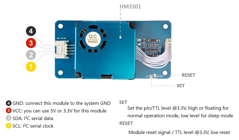 The HM3301 is a sensor that can measure the concentration of dust particles in the air. It can detect particles at three size ranges - 1.0 ug, 2.5ug and 10ug.
